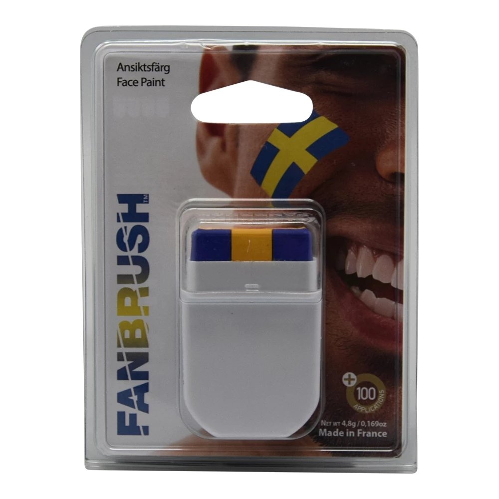 Praktiskt sminkset med penslar i svenska färger. Perfekt för att måla ansiktet vid supportertillfällen, nationaldagen eller andra svenska evenemang. Dra penslarna mot huden för bästa resultat.